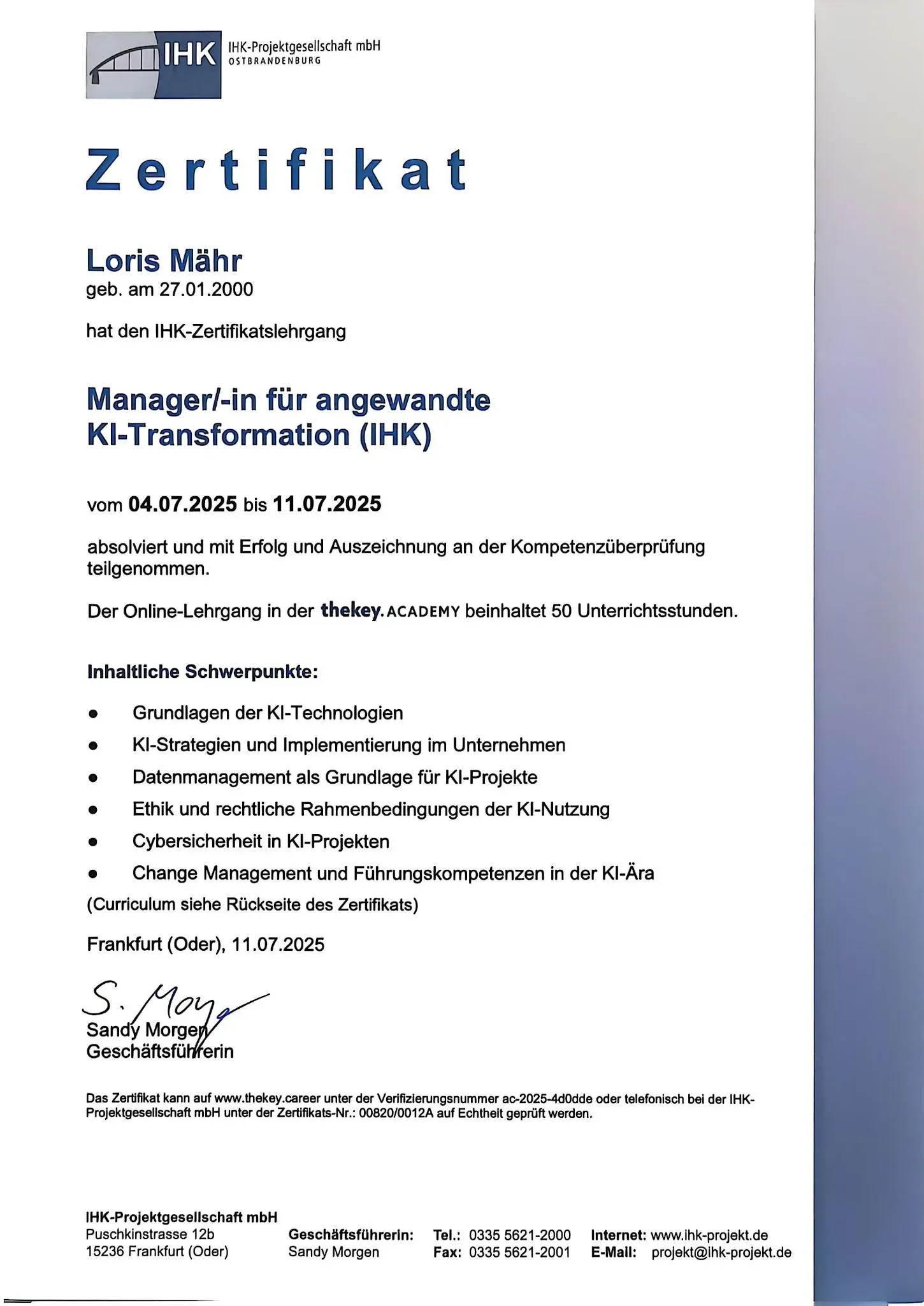 Dieser Abschluss befähigt maehrsteuern, vertreten durch Loris Mähr, die Transformation und Implementierung von KI-gestützten Prozessen in Unternehmen eigenständig und eigenverantwortlich zu führen und zu begleiten.